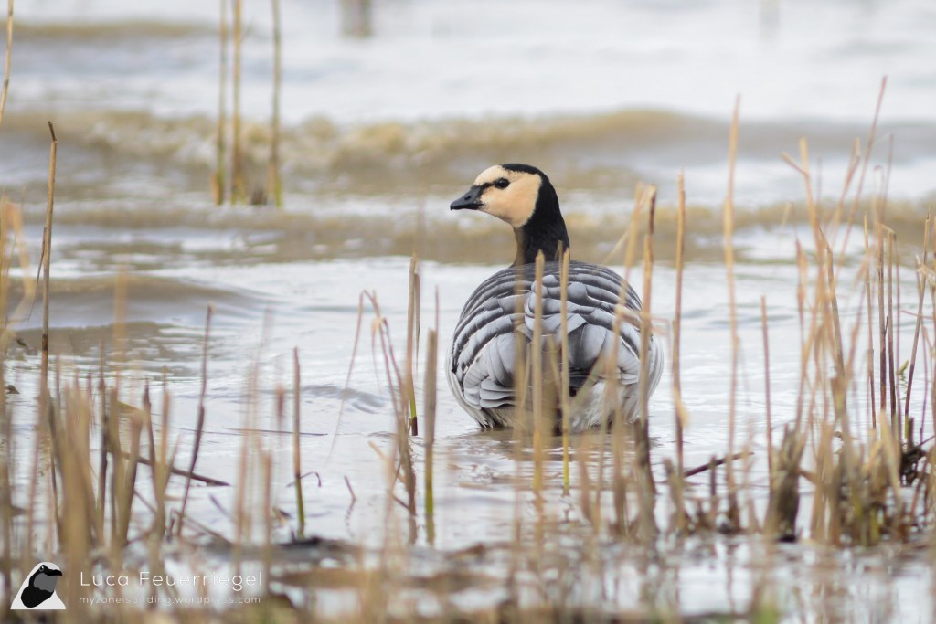 I ate some sandwiches and continued South along the dyke and stopped at the visitors center where I locked my bike and walked along the trails a bit, spending most time at the Keersluisplas hide. I was greeted by a single Barnacle Goose that found some protection from the wind in front of the hide. After a while, I was busy watching a female Common Pochard when for a fraction of a second, a black and white bird appeared on the edge of my binoculars’ field of vision – unmistakably a Smew. However, before I could focus on it, it had disappeared. The Smew is a bird I’ve wanted to see for years, so I naturally was very excited as I hoped for it to reappear for a proper view. Since I only got a brief glimpse, combined with the party I was at until just a few hours earlier, however, this excitement rapidly turned into unsettling uncertainty as I thought that my mind was playing tricks on me. Fortunately, after a few minutes, this fear was allayed as the male Smew reappeared in all its glory. I obtained some excellent views of this elegant bird, and a while later, another male arrived with two females, accompanied by several more pretty Common Pochards.