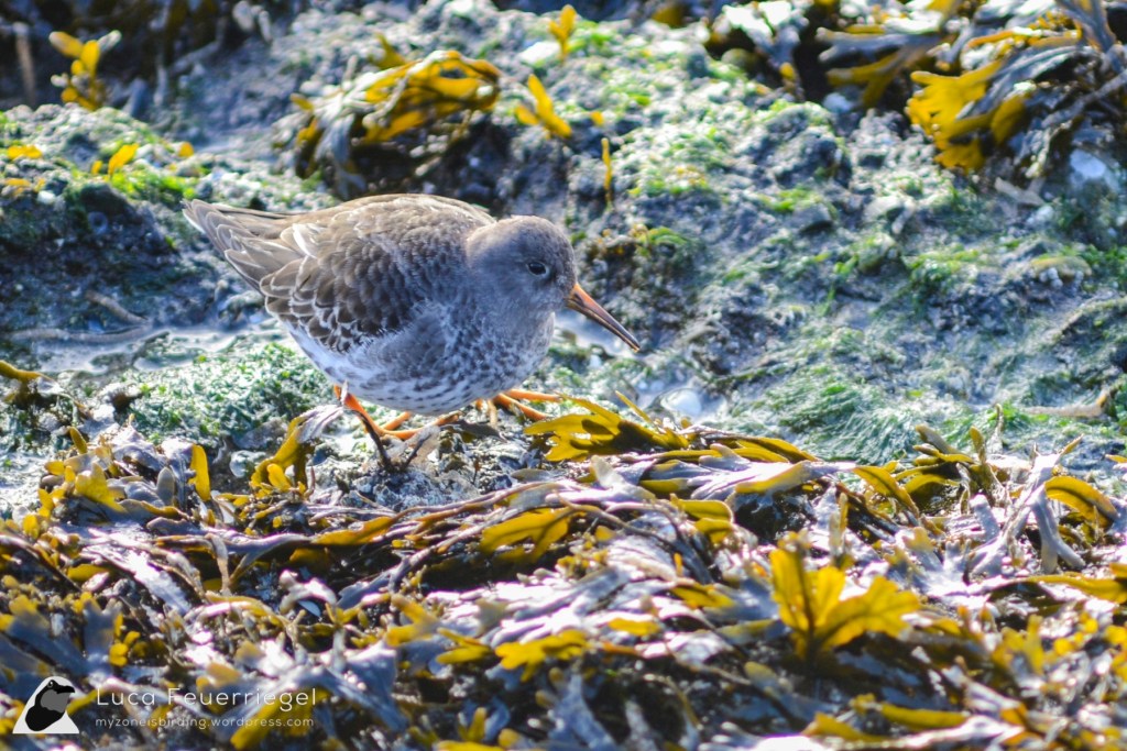 Just as other birders already present on the scene, we did the only sensible thing and took cover on the beach just to the south, where the pier blocked the worst of the wind, and scanned through a group of gulls on the beach. This was good ID practice for me, as I have very little experience identifying gulls. While I was hoping for a less common species, it turned out that there were four common species in the flock: Black-headed, Herring, Great Black-backed, and Lesser Black-backed Gulls, but no rarer species. Eurasian Oystercatchers, foraging and resting among the gulls, were a nice addition. Overhead, Great Cormorants constantly passed, but we were on the lookout for European Shag. After one or two uncertain birds, a Great Cormorant passed overhead with what was in direct comparison definitely a European Shag. On the rocks forming the base of the pier, a large number of Ruddy Turnstones was roosting together with two Sanderlings. The wind abated a bit so we walked along the pier up to the gate that barred further access, some 50m from the shore. Three tame Purple Sandpipers allowed a close approach as they foraged on the sheltered side of the pier – another lifer and target of the day. After some time, we located three Common Scoters were floating on the rough waters quite a distance away. The storm made it hard to keep the scope stable as I only have a monopod, but after a while we both got adequate views.