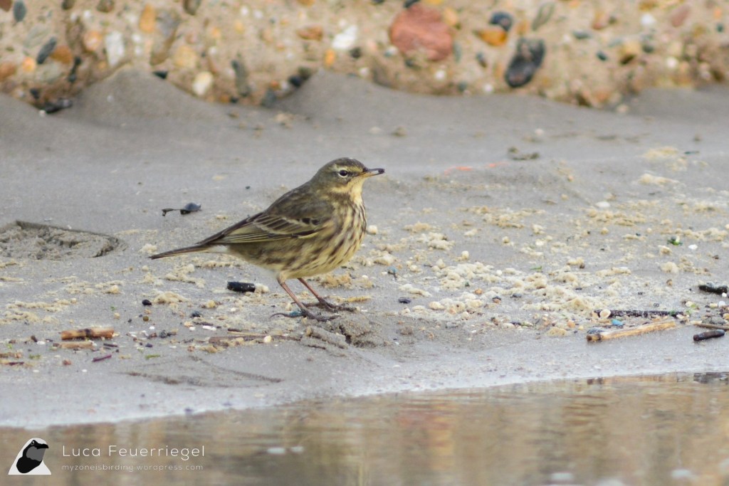 We took the trains to get to Schiphol, and from there a bus to Ijmuiden, stopping at the last bus station right at the harbor. Alighting from the bus, we were greeted by extremely strong and cold wind that had us both shivering so much that before even getting to the pier, we started to doubt whether this outing had been a good idea. The harbor held Great Crested and Little Grebes, Eurasian Coot, and Great Cormorant while many Black-headed, Common, and Herring Gulls were flying overhead and a group of House Sparrows took shelter by the buildings. At the start of the pier, we noticed that the pier itself was closed because of the wind, and a local resident told us that it was very unusual that the wind comes from the North, usually it comes from the south west. Given that the pier is the main highlight at this spot, this was quite a disappointing start. We were compensated by a close-up Rock Pipit however, which ended up being very common along the start of the pier.