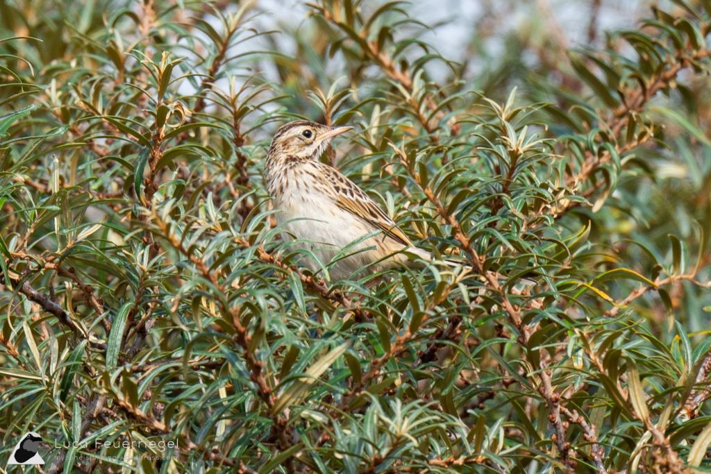One of the rarest vagrants came one day as Jacob and I rushed to the Oberland between trapping sessions to watch a very tame Little Bunting that had photographed before. We were unlucky in this regard but as we were some distance apart on two small hills close to the Pinneberg, we both got a notification: Isabelline Shrike, North-East area. We looked at each other and Jacob shouted “let’s run!”. And that’s what we did. We got to the site within a few minutes and were told the bird was flushed from the ground and briefly perched on a bush, but then disappeared into a thicket. We started searching the area with fervour, but some of the tension was lifted as I had the comical sight of birders gradually appearing out of nowhere and walking across the football pitch towards the site, as if they were spawning from some invisible location beyond. We had to return for the last trapping session of the day which fortunately did not produce much; so off we were again, running to the site. This time we were lucky as the bird had been relocated as we arrived, panting. We ended up seeing the Isabelline Shrike for an hour on and off, but apart from a few seconds, it remained incredibly well hidden in the thicket as the light faded. The next morning, there was no trace of it.