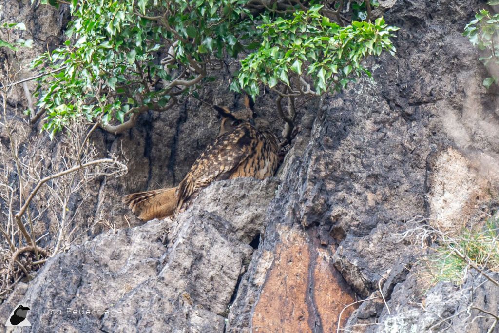 After having twitched the Wallcreeper at the Drachenfels outside Bonn in January (covered in my previous post), I visited the site again with my parents so that my father could see the bird as well. The bird had now been around for over two months and drew a significant number of birders in this time. We did see this species, but it was higher up on the cliffs compared to last time, and thus the views were not as good. It also soon disappeared into an area out of sight, which meant we had to entertain ourselves with other sightings. This was not difficult though as another birder alerted us to the presence of a Eurasian Eagle-Owl, which roosted on the cliff under the cover of a dense ivy ticket. It afforded excellent views, although darkness provided by the ivy made it hard to pick up against the bright surrounding cliffs.