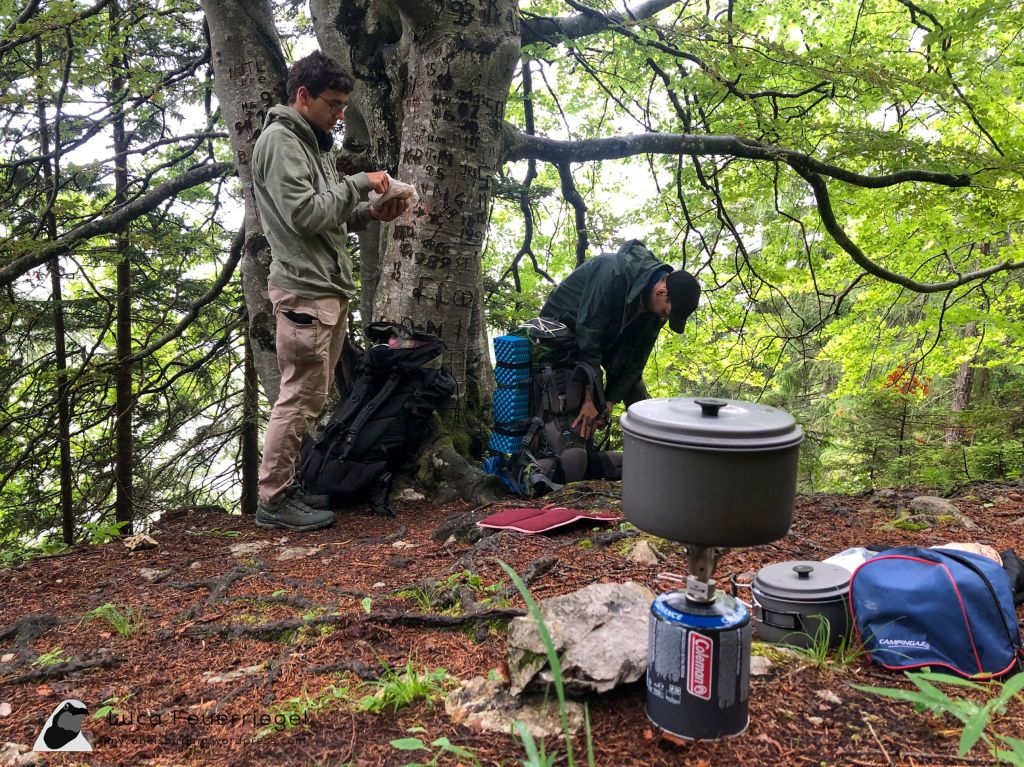 Ascending the mountain, we started having a selection of typical forest birds including Eurasian Treecreeper, Eurasian Firecrest, Eurasian Bullfinch, Common Chaffinch, Western Bonelli’s Warbler, Coal Tit, and Black Woodpecker. The highlight and simultaneously most frustrating sighting was that of a Red-breasted Flycatcher. It called for ages from dense thickets (here), but I only managed a split-second glimpse of a red-throated bird with a cocked tail that could not have been anything else (despite our confusion regarding the wren- and robin-like call). Northern Raven and Alpine Cough joined the list, while a Eurasian Nutcracker remained heard-only. We arrived at the hut at 5pm sharp, the latest by which guests should arrive.