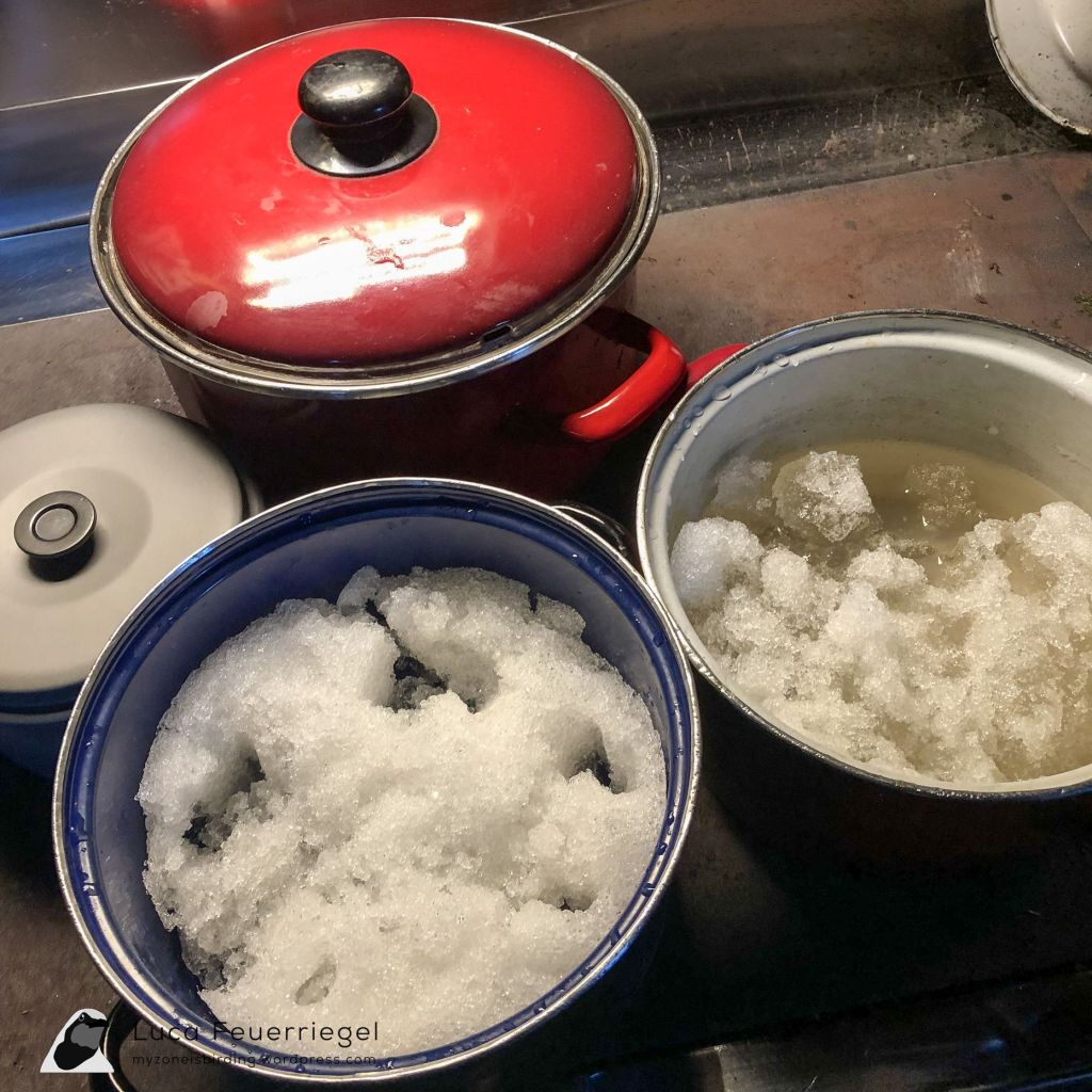 Despite our exhaustion, we were very eager to climb the peak of the Arnspitz, so we headed up without our backpacks, a very enjoyable feeling. Arriving at the peak at 2196 metres and the cliffs breaking off nearly vertically in places with the valley being visible far below, I suddenly felt more like sitting down than strolling around on the peak. Fortunately, we had a smooth descent and were happy to find that we were the only ones sleeping at the hut. The hut itself was fantastic, being tiny but offering all the we needed. It had way more character than the other huts (even with a tiny well-stocked bookshelf!), and made us want to stay two nights. However, we realised that we did not bring enough water (there was no running water). We had already filled up some of our bottles in the Isar river earlier in the day as we significantly underestimated the amount of water we needed (the previous days were cloudy and cool, meaning we drank much less). Fortunately, there was a small snow field in front of the hut, which allowed us to “harvest” some snow and melt it on the wood-fired stove. This was actually very fun and we enjoyed fantastic views of the surrounding mountains while eating dinner.