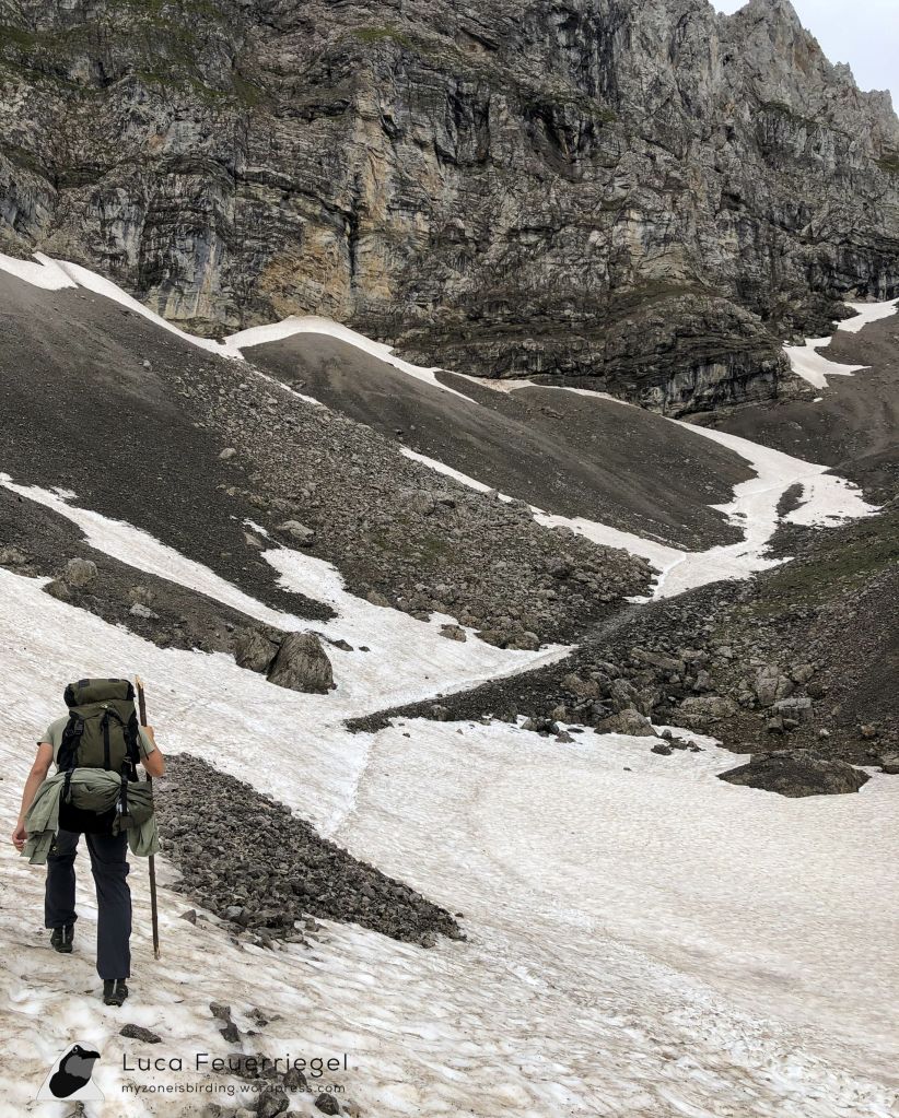 Soon after leaving the hut, the track became very tough to traverse as it alternated between loose spree and snowfields, being steep all the way up to the Dammkartunnel. It was still rather dark, but we saw Black Redstart, White-winged Snowfinch, Northern Raven, and Alpine Chough. The real special was a Wallcreeper that I spotted at a distance on the high cliffs that engulf the narrow valley. The area here right in front of the Dammkartunnel is apparently good for Rock Ptarmigan, but we didn’t see any.
