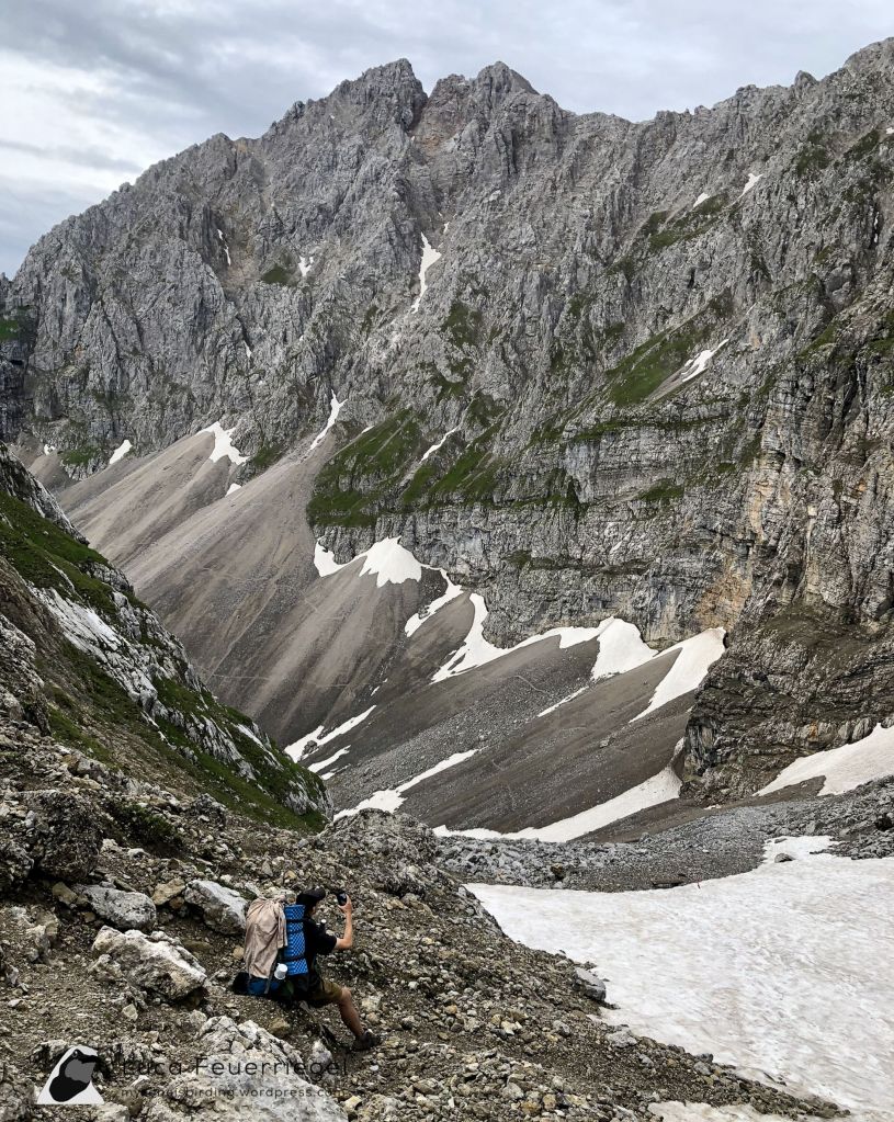 We initially planned to ascend to the Karwendelgrube and from there hike to the Brunnstein hut, but aving heard from other hikers that the trail up to the Karwendelgrube will be impossible to do without climbing gear, we decided to pursue a different route and descend a bit before hiking to the Brunnstein hut. This was definitely a good decision as we chose the initial route rather naively without knowing the conditions. However, we were desperate to reach the Karwendelgrube later on the trip, given the selection of good birds to be found there. Any regrets evaporated however when we saw a White-backed Woodpecker a few hundred meters below the Mittenwalder hut, a lifer for me. After a nice breakfast on the trail, we had a Eurasian Three-toed Woodpecker in an area with spruce, another great bird. Some other nice sightings were Western Bonelli’s Warbler, Eurasian Nutcracker, Northern Raven, Coal, Crested, and Willow Tits, Goldcrest, Mistle Thrush, Eurasian Bullfinch, and Common Crossbill. Around the Brunnstein hut we had Black Redstart and Lesser Whitethroat.
