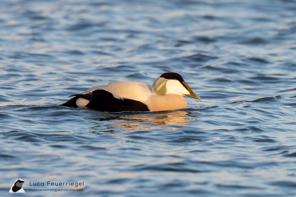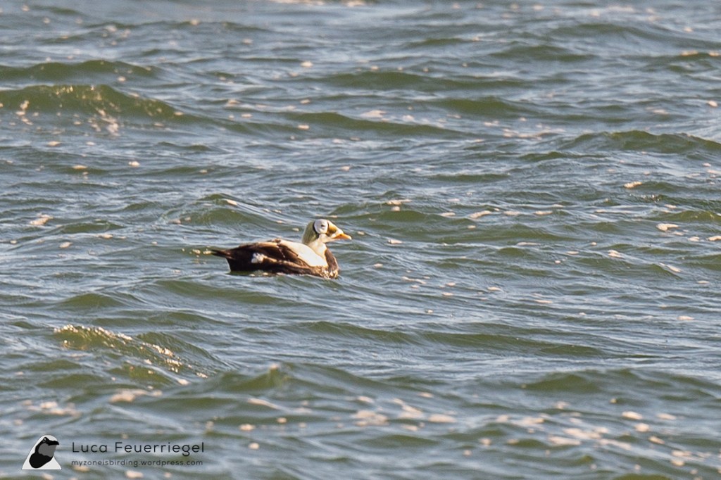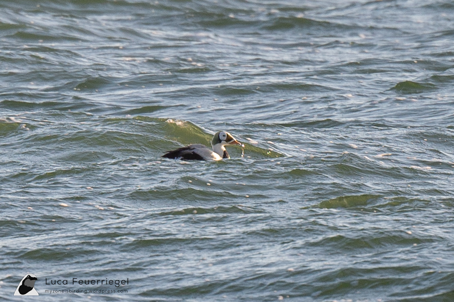 I knew that I had arrived at the spot when I saw around 30 people who were still standing on the track along the dyke in the waning light, scopes pointed in the same direction. This was assuring, but after some effort at maneuvering my scope detatched from the tripod ended unfruitfully, a birder from Norway offered me to look through his, giving me okayish views of the Spectacled Eider as it floated far out at sea in a large group of Common Eiders. After I had picked up enough details like the orange bill, green nape and white spectacles, I happily proceeded in watching other birds that were a bit closer to shore. A Red-breasted Merganser was fun to see, only ever staying at the surface for a few seconds before vanishing. Some close-up Common Eiders were more obliging, and were as fun to watch as their Spectacled cousin, given that the latter was simply too far to view decently in the low light.