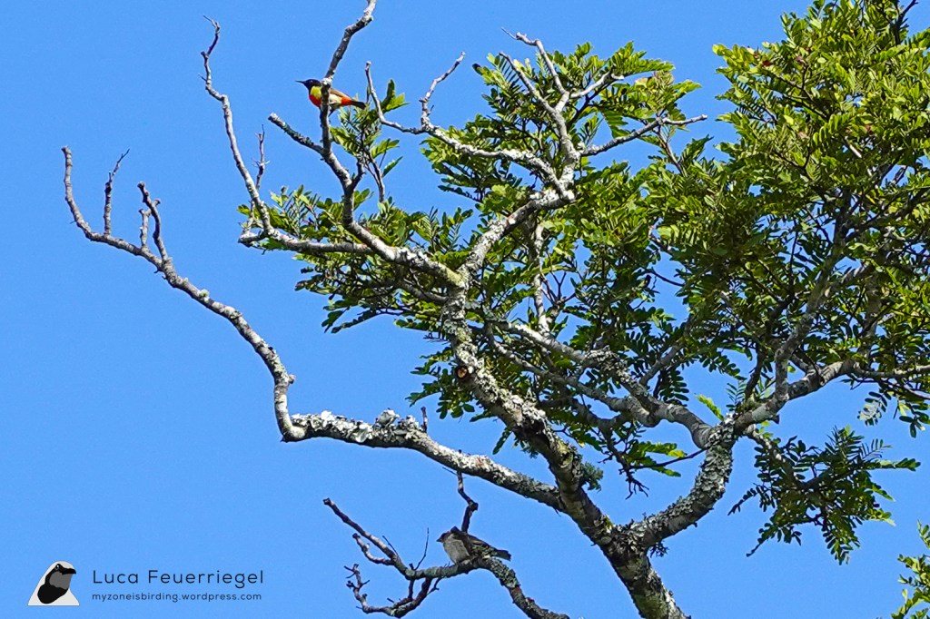The campsite and lodge rock themselves were quite productive. White-necked Ravens have taken up the niche typically occupied by vervet monkeys on campsites, raiding any foodstuffs not locked away when the site’s occupants are out and about. A confiding Miombo Scrub-Robin serenaded me with its beautiful song, and Familiar Chats and African Dusky Flycatchers were also around. Bird parties moved through at a regular interval, containing White-breasted Cuckooshrike, several flycatchers and sunbirds, and Yellow-fronted Tinkerbird. Whyte’s Francolins called from the slope around the bungalows of lodge rock, but I failed to locate them. Aside from the excellent views and refreshing drinks, the bar should be an excellent raptor-watching spot.
